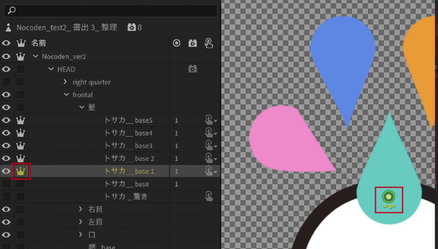 レイヤーの必要な箇所に、王冠マークをつけることで、独立して動くパーツとして認識されるようです。さらに、レイヤーやレイヤグループに付属するオリジンハンドルという二重丸みたいなヤツで動きを想定して、動きの軸となる場所を設定します。