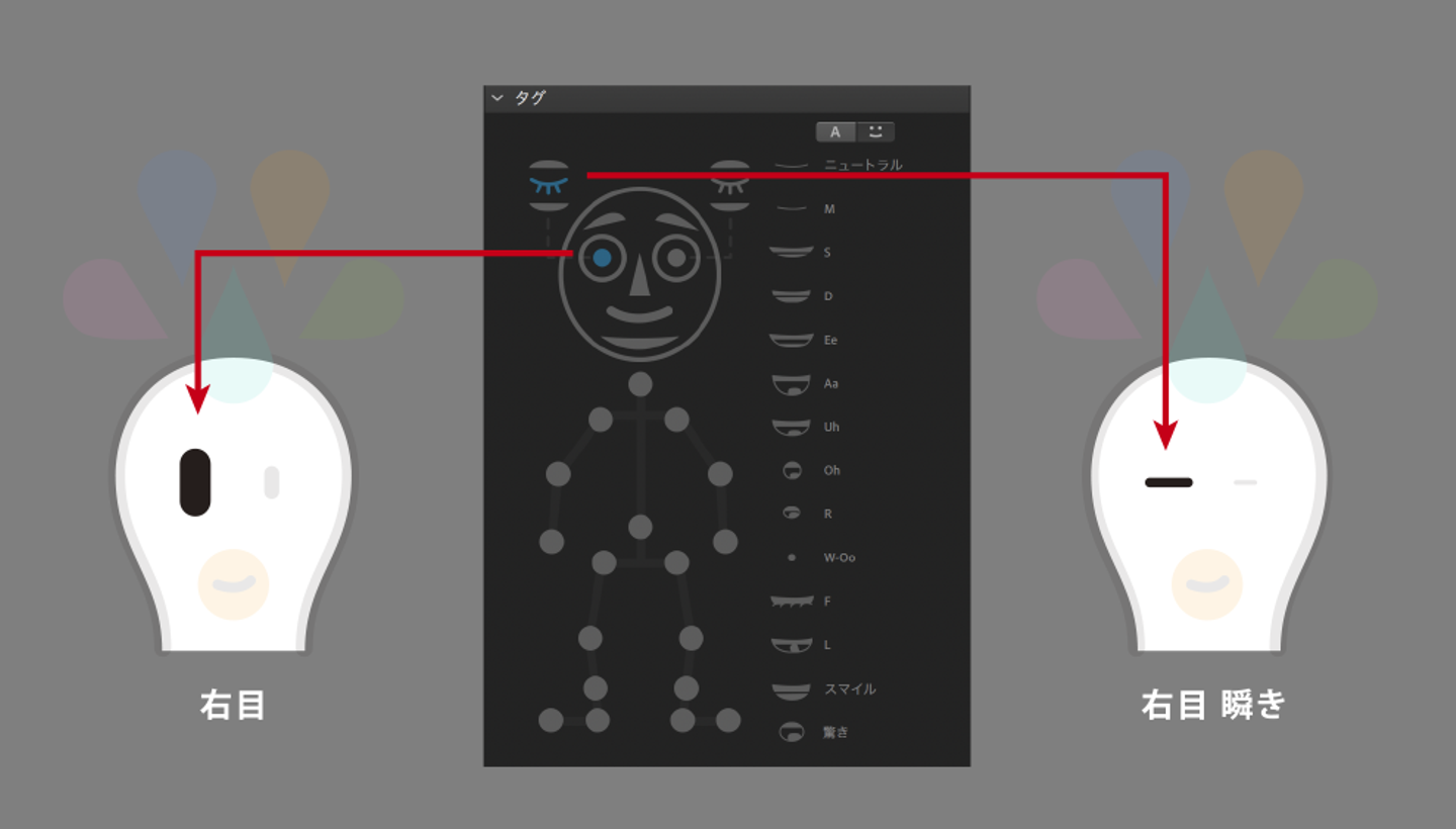 ベースとなる右目レイヤーに右目タグを、右目瞬きレイヤーに右目瞬きをタグを設定すれば、2つのレイヤーを使って右目の瞬きの動きができるように!