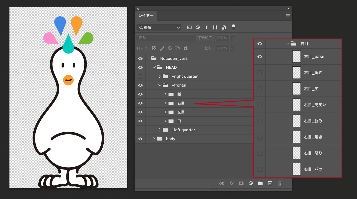 ⚫︎「同じパーツのパターン」はレイヤーグループにまとめて作ることで自動認識