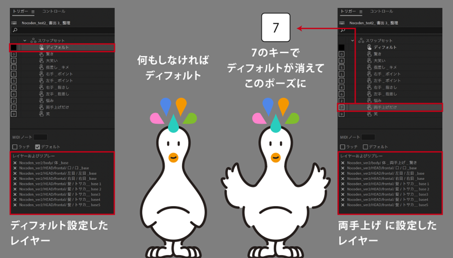 すると、キーを押した時はディフォルトは消えて、指定ししたポーズが表示される、というものです。