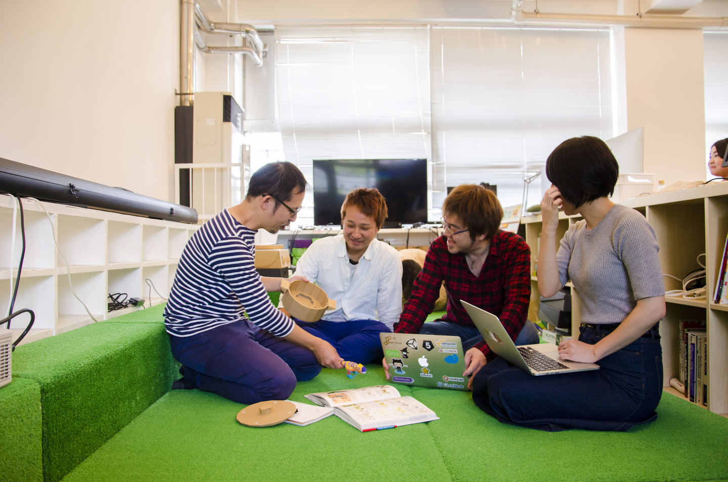 弊社のオフィスは元中学校の教室なのですが、半分はキッズスペースとして人工芝のマットを敷いています。ここで車座になり、子供目線であーでもない&こーでもないを行います。