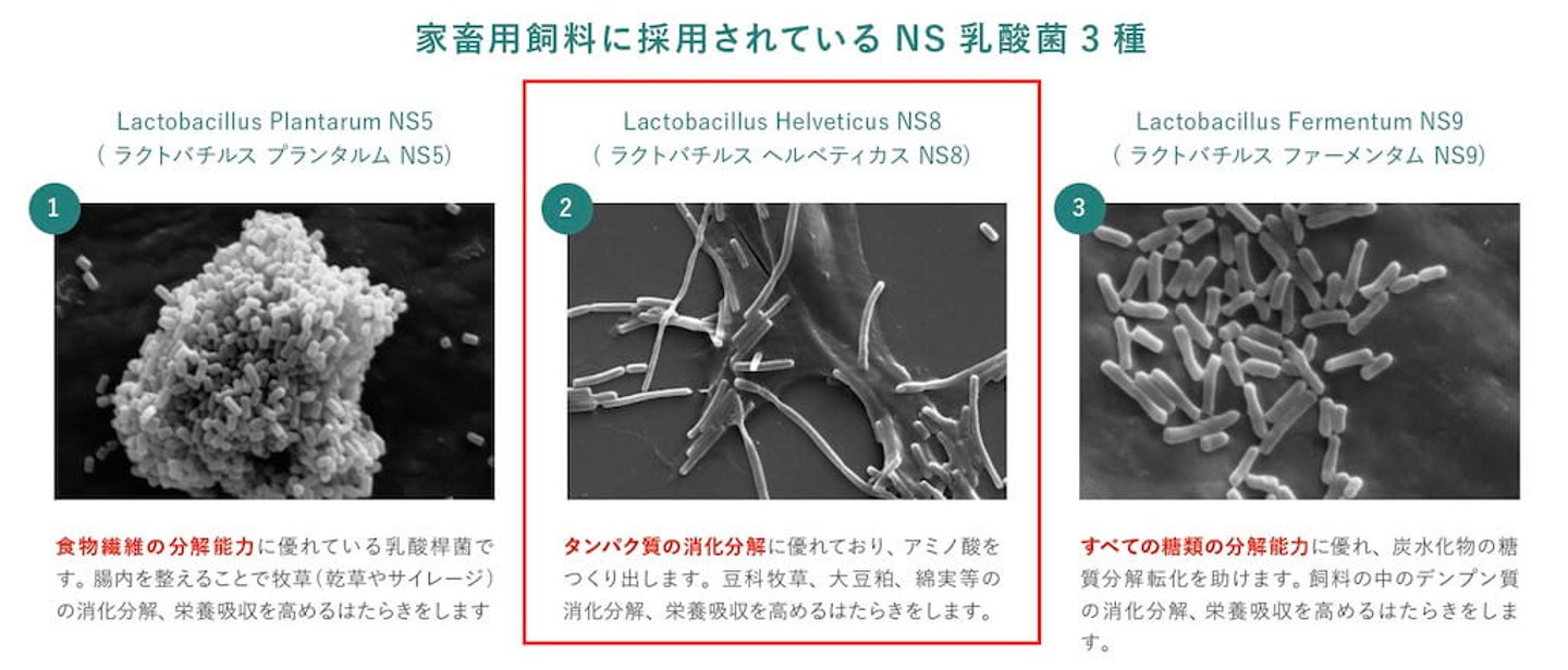 繊維分解や糖デンプン分解能力のある乳酸菌はこれまでにもありますが、NS 乳酸菌の場合はタンパク分解能力に強みを持つ菌種(NS -8)が配合されていることにより、現代の畜産における濃厚飼料のタンパク源の消化性を上げることが可能となります。