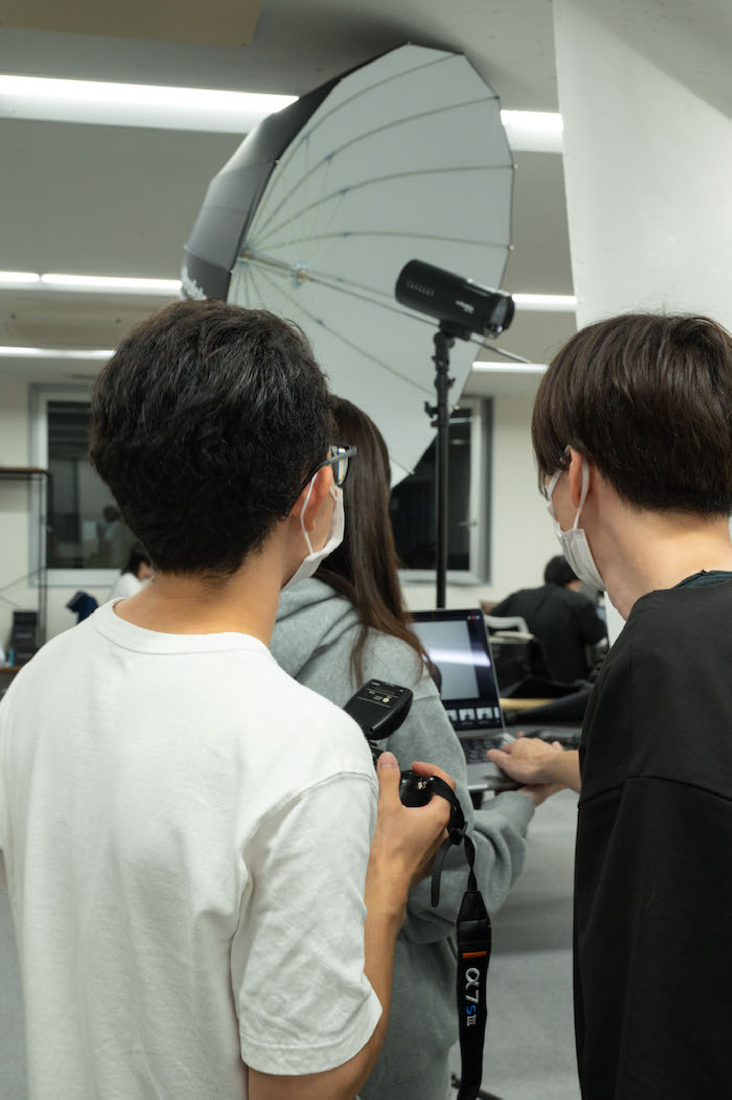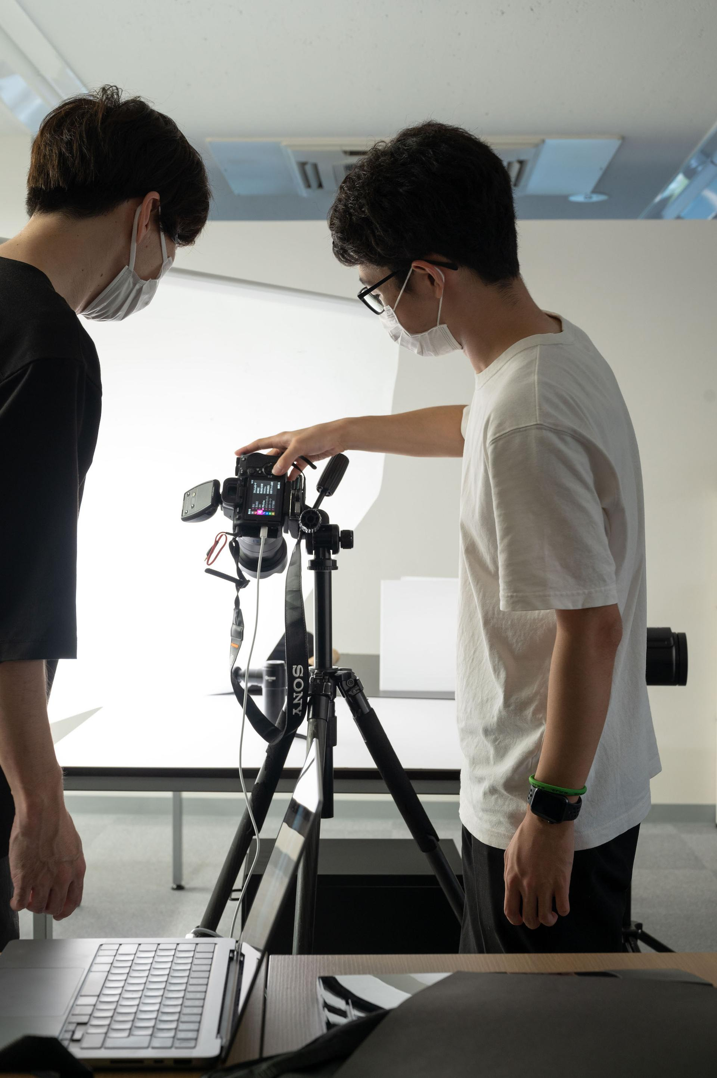 ▼カメラの基本的な設定や物撮りの照明について教わる様子