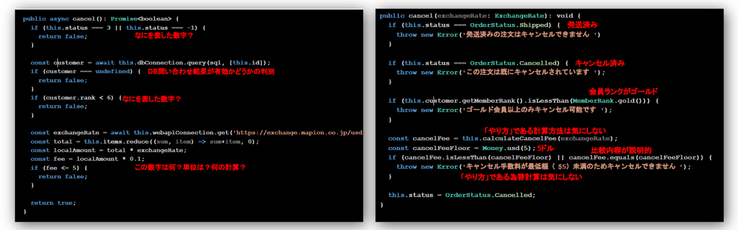 ▼ECサイトの注文キャンセル機能を例に、リファクタリング(※)前後のコードを比較
