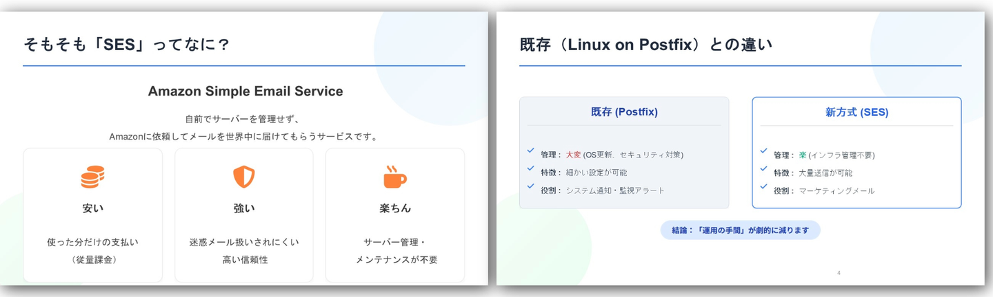 SESを利用するにあたって、運用コストや効率、届きやすさの向上がメリットであるのに対し、ベンダーロックインやルールの厳しさはデメリットであると話します。