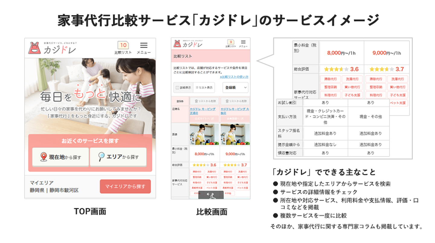 渡邊:一言で言うと、家事代行の比較サイトです。カジドレは、全国の家事代行/ハウスクリーニングの事業者様が集まっているプラットフォームで、居住地、料金、対応サービス、支払い方法、口コミなど、ユーザーごとに自身のニーズに合った事業者様を探すことができます。