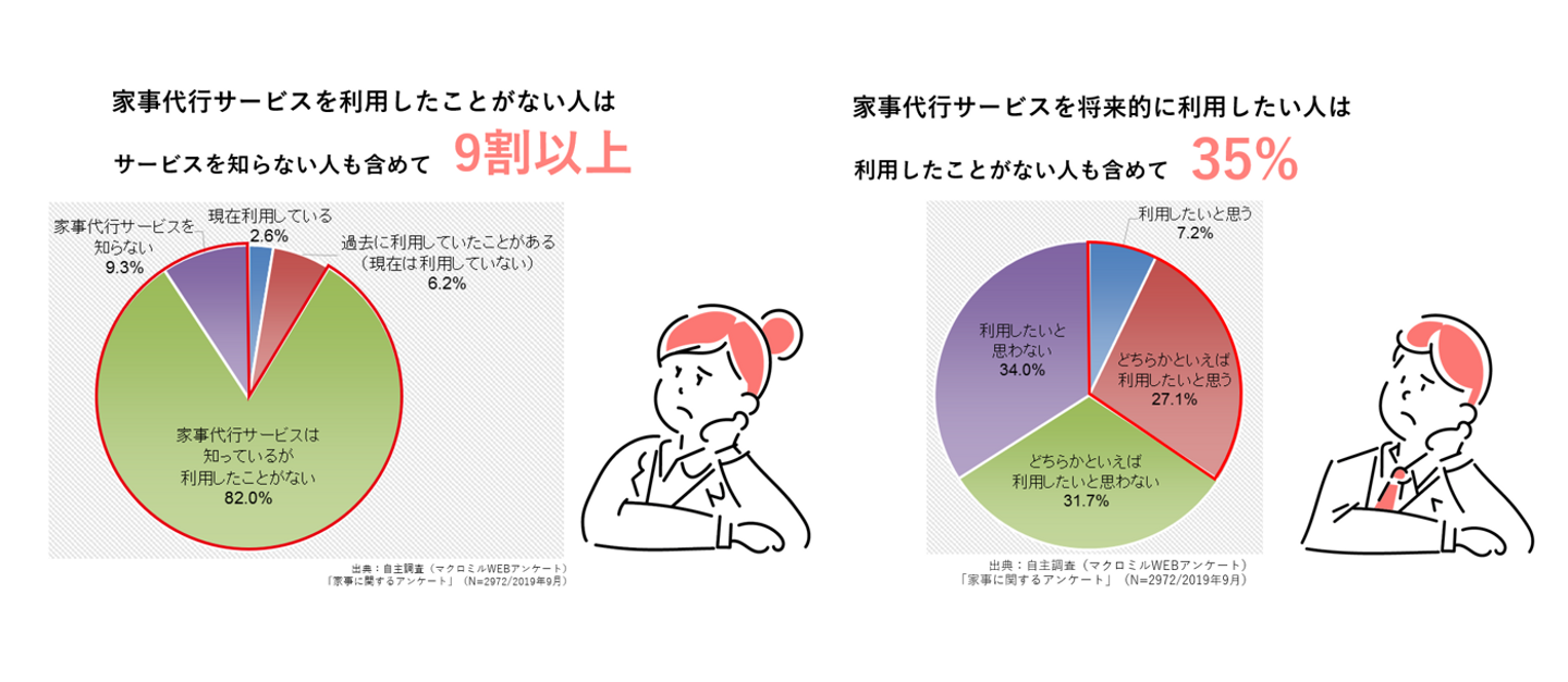 弊社で家事に関するアンケート調査を行った結果、90%以上の方が家事代行サービスを利用したことがない、サービスを知らないという結果でした。一方で、将来的に利用したいと思っている方は約35%でした。