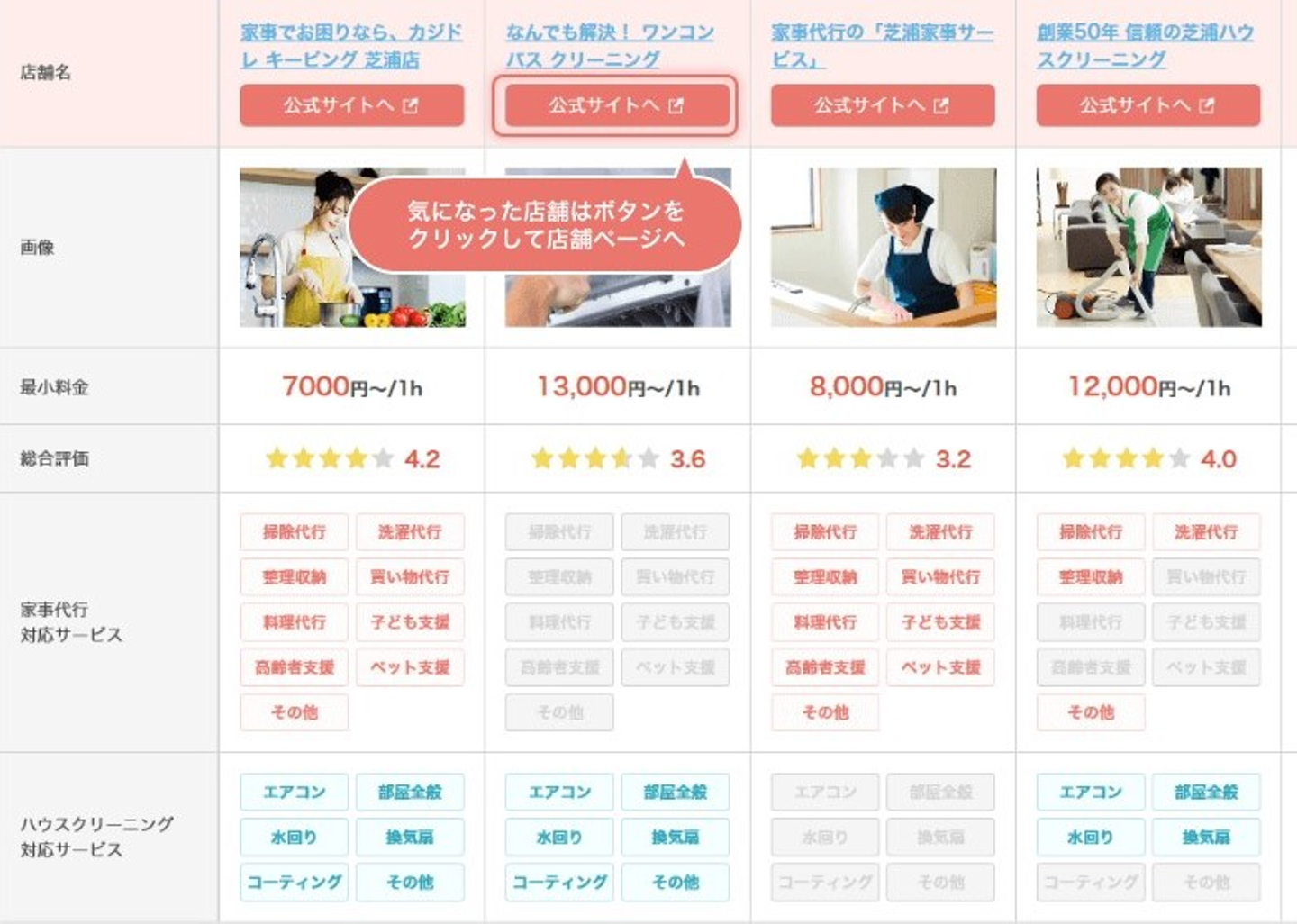 ②:サービスの詳細情報(対応エリア・サービス、利用料金や評価・口コミなど)をチェック