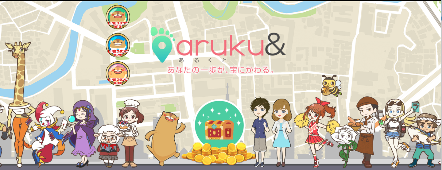 【aruku&(あるくと)】は、『ヘルスケア × エンターテインメント』という視点で展開されるウォーキングアプリです。アプリ内の地図上に表示されているキャラクターに話しかけて依頼を受け、その依頼を歩くことによって達成し、報酬カードをGETします。そして集めた報酬カードを使って、各種賞品に応募することができます。