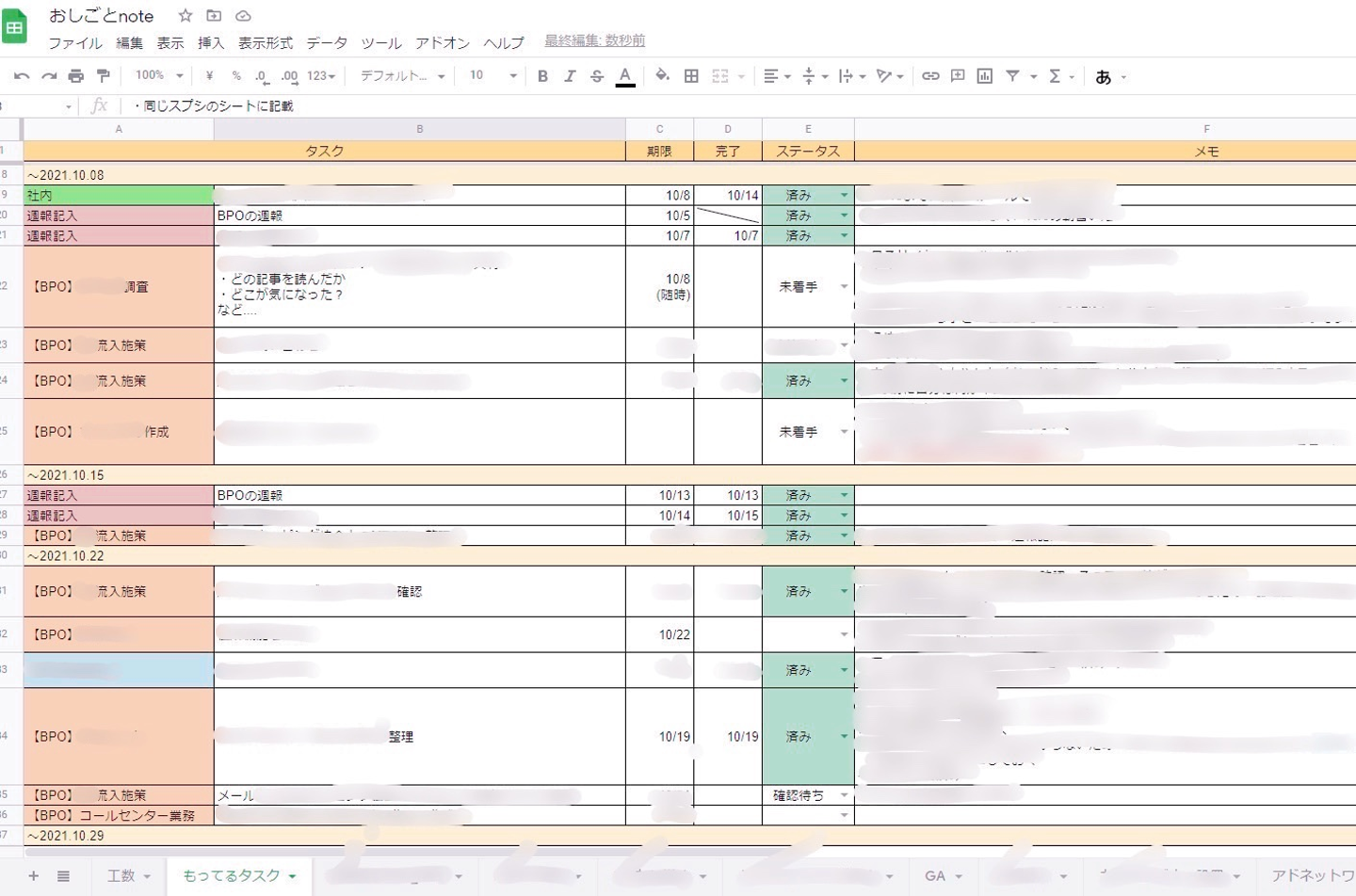 余談ですが、自分の仕事を整理していないと混乱してしまうことがあるので、自分専用のお仕事ノートをスプレッドシートで作り、整理をしています(笑)