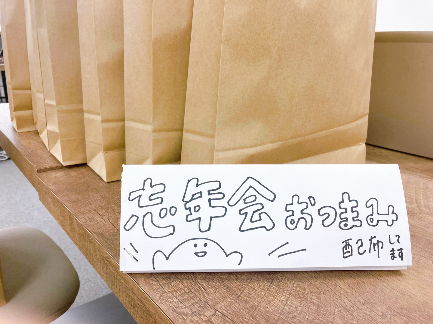 →参加者のみなさんに配布するおつまみは幹事それぞれのおすすめの一品にし、手書きのメッセージカードを添える