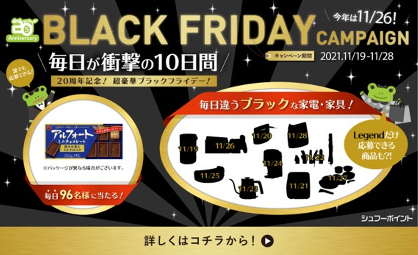アメリカの流通業界における大きなお祭り「ブラックフライデー」ですが、近年日本の流通業界でも盛り上がりを見せております。その波に乗ったキャンペーンをしよう!ということで、Shufoo!でもブラックフライデーキャンペーンを企画し、豪華賞品を用意しました。