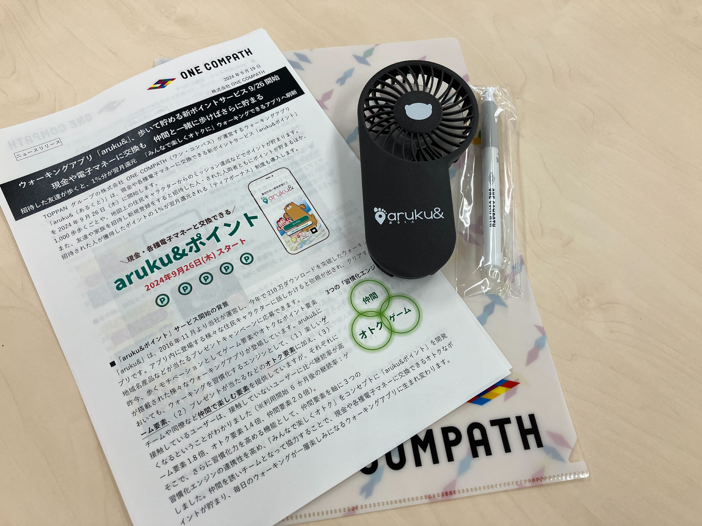 ニュースリリースとお土産のモバイルファン(aruku&オリジナル!)&ボールペン