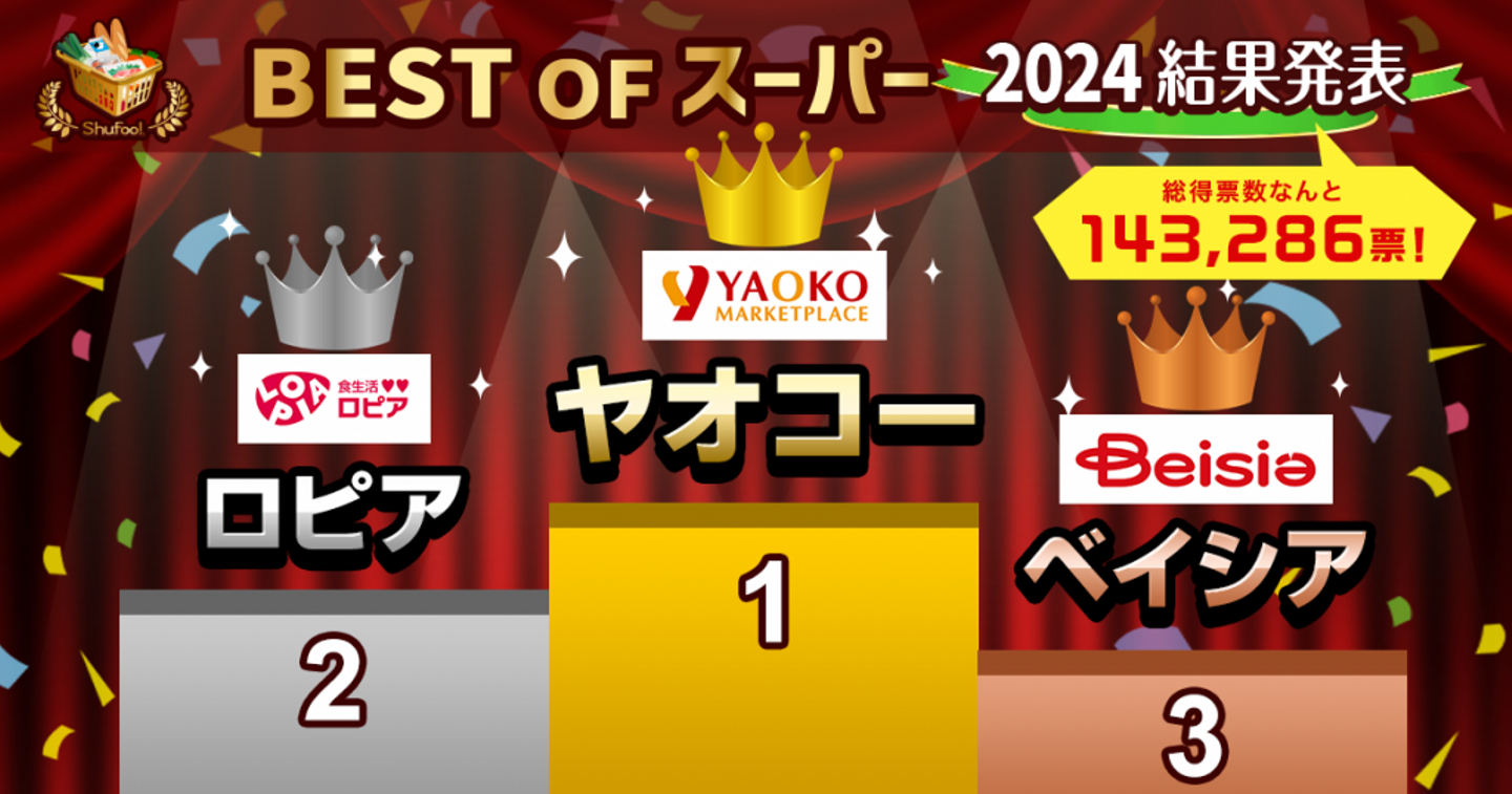 今夏、電子チラシサービス「Shufoo!」では、全国の生活者が最高のスーパーを選ぶ「ベストオブスーパー2024」を開催しました。全国のスーパーマーケットを対象に投票を行い、8つの項目(品揃え・コスパ・サービス・チラシ・肉・魚・野菜・お惣菜)において、星5つの中で得点をつけていただき、総合得点で順位を決定しました。投票件数はなんと14万票超え!