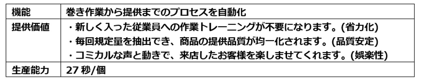 同ロボットは長崎ハウステンボスやポッポイトーヨーカドー幕張店で稼働しているロボットです。一定期間の習熟が必要とされるソフトクリームの巻き作業を自動化することで、ボタン一つで品質の安定した商品を提供することができます。