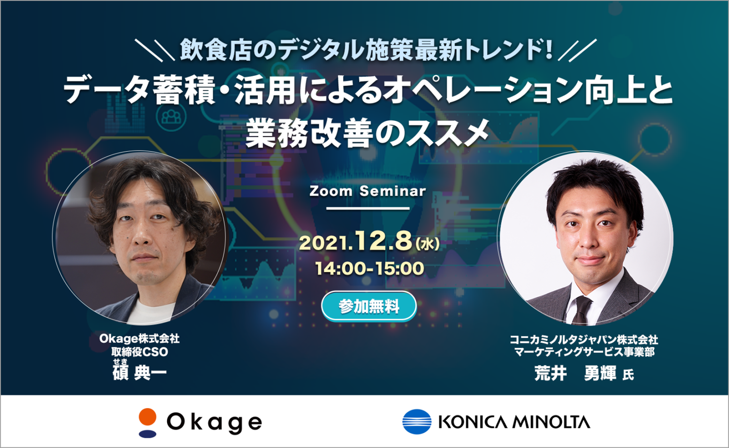 飲食店のDXを支援するOkage株式会社(本社:東京都中央区、代表取締役CEO:内田 善久、以下「Okage」)は12月8日(水)、飲食事業者様を対象に、AIツールで発注・販促・SV等の業務効率化を推めるコニカミノルタジャパン株式会社と無料Zoomセミナー「飲食店のデジタル施策最新トレンド!データ蓄積・活用によるオペレーション向上と業務改善のススメ」を共催いたします。