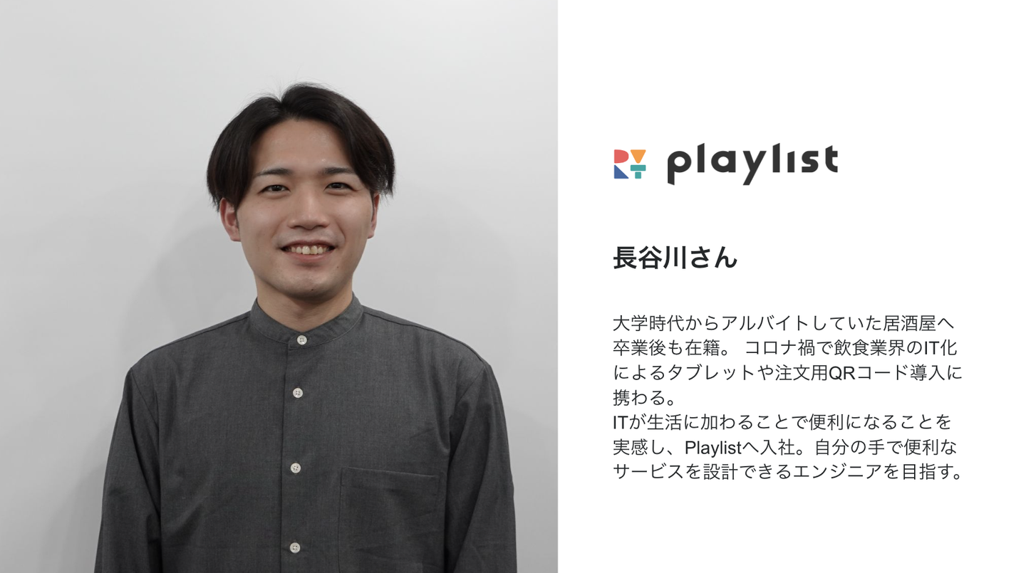 今回は居酒屋店員からPlaylistに今年1月に入社し、駆け出しエンジニアとして一歩目を踏み出された長谷川さんにインタビューしました! 入社後2ヶ月間のテスト案件からスタートした長谷川さんが振り返る「つまづき」と「楽しさ」とは?