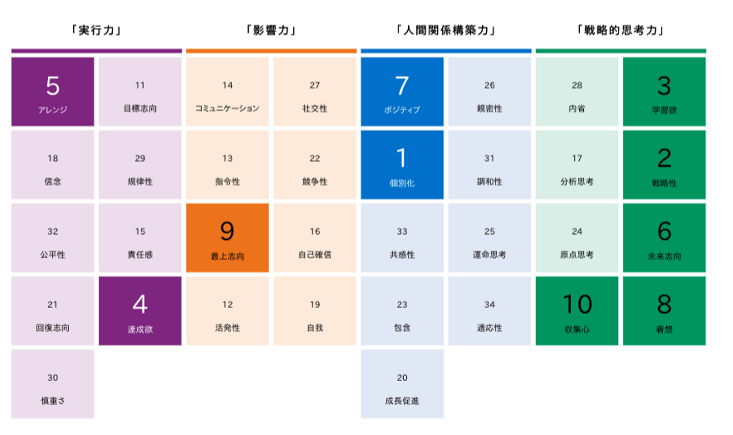 ストレングスファインダーは、177の質問に答えると、34個の資質の中から自分の「強み」や伸びしろを見出すことができる才能診断ツールです。ストレングスファインダーにおける「才能」は『無意識に繰り返し現れる思考、感情、行動のパターン』と定義されています。