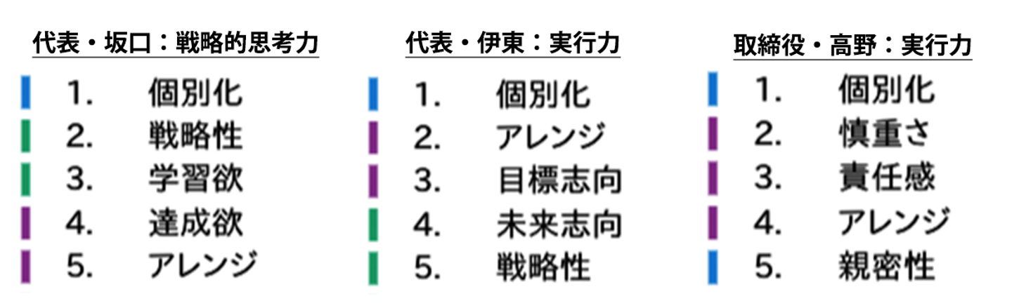 ProfitMakersでは全社員がストレングスファインダーを受け、自分の5つの特徴を知り、それを社内でも共有しました。診断結果は主に新規メンバーと在籍メンバーの親交を深めることや、プロジェクトアサインなどに活用しています。