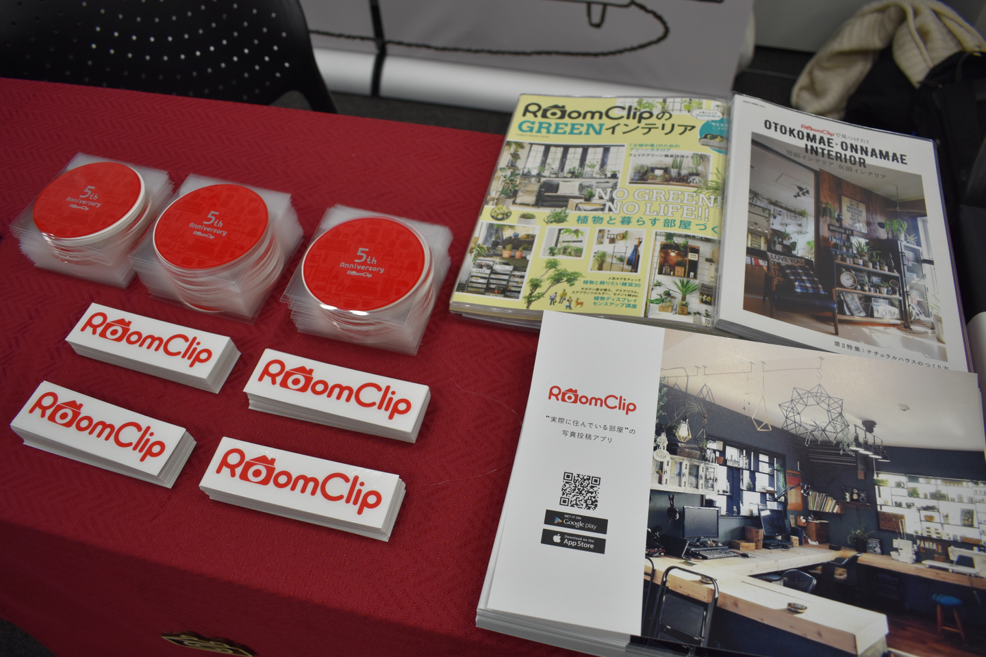 DroidKaigi用に新たに作成したフライヤー(右下)や、RoomClip5周年記念コースター(左上)、さらにはRoomClipステッカーを来場者の皆さんにお配りしました。受け取っていただいた皆さん、ありがとうございました!