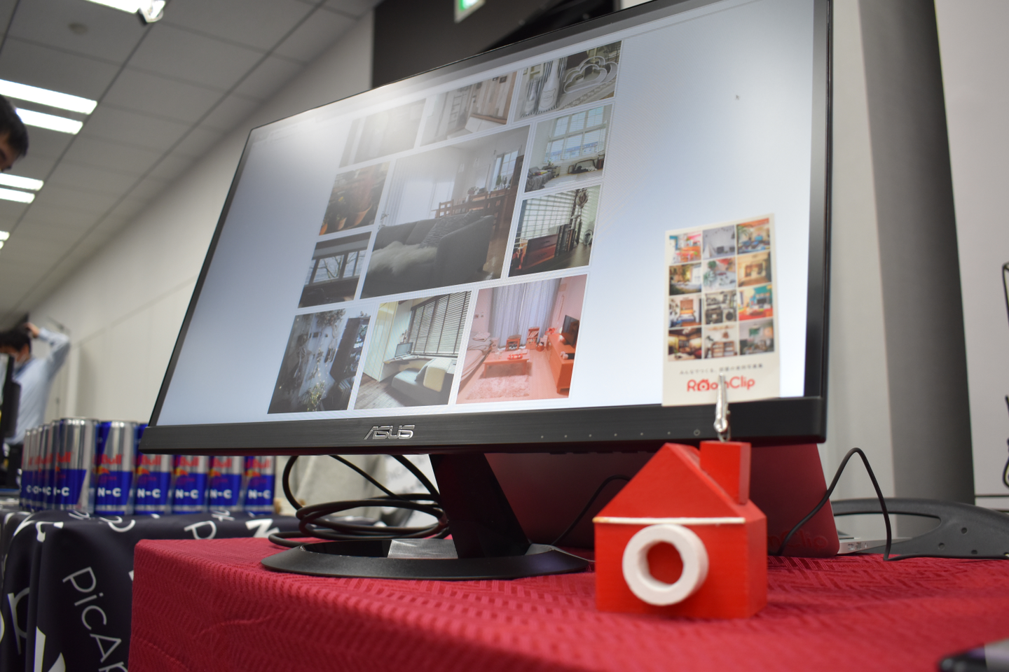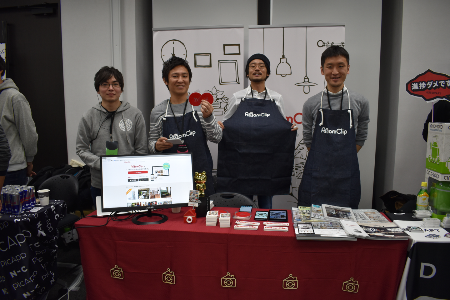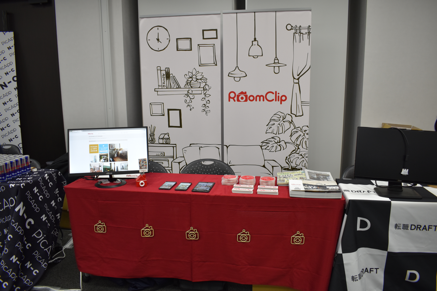 RoomClipは企業スポンサーとして初めての参加で、もちろんブース出展も初めてでした。試行錯誤しながら、エンジニアメンバーとコーポレートメンバーが毎週MTGをして、完成したブースがこちら!背面にあるロールアップバナーは社内デザイナーが、RoomClipらしさを出すべくオリジナルで作ってくれました!!