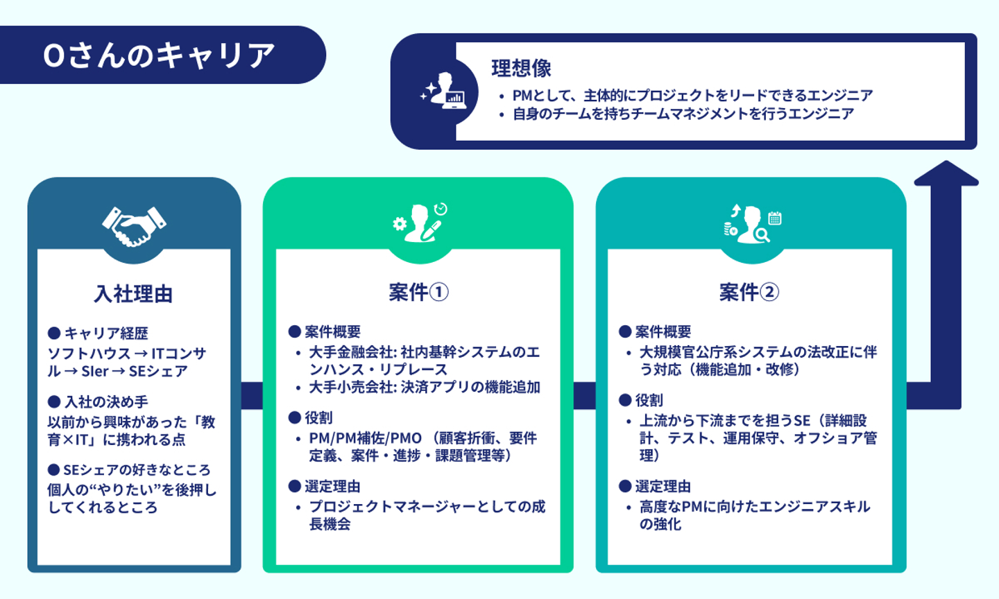 Oさんは、理想のエンジニア像から逆算し、PMやPMOなどプロジェクトマネジメントに携わることができる案件(上図:案件①)を積極的に選択。案件①を通して、ビジネスサイドの顧客への提案能力、複数案件を同時進行しつつ課題解決を行うマルチタスク力、チームマネジメントスキルを伸ばしてきました。そして、直近の3年間はPMとしてより力を発揮するために、SEとして上流から下流までを一気通貫で担当できる案件(上図:案件②)に従事し、エンジニアとしての基礎スキルやステークホルダーへのコミュニケーションスキルに磨きをかけています。