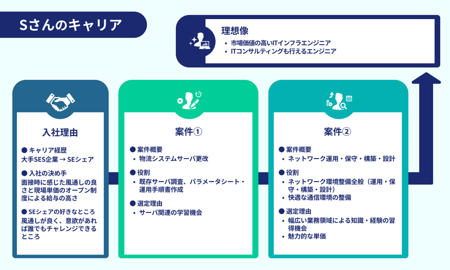 続いてのキャリア事例は、2023年に入社したSさん。SEシェアに入社した理由は、面接時に感じた風通しの良い社風と現場単価のオープン制度による給与の高さ。Sさんは「市場価値の高いITインフラエンジニア」「ITコンサルティングも行えるエンジニア」を理想のエンジニア像として掲げています。