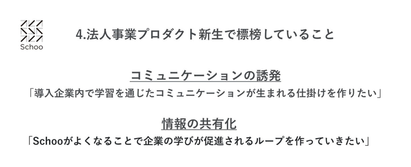 こうした社内のコミュニケーションが誘発され、社員がSchooでの学習を通じて、成長の過程を楽しめるような仕組みをプロダクトに作っていきます。