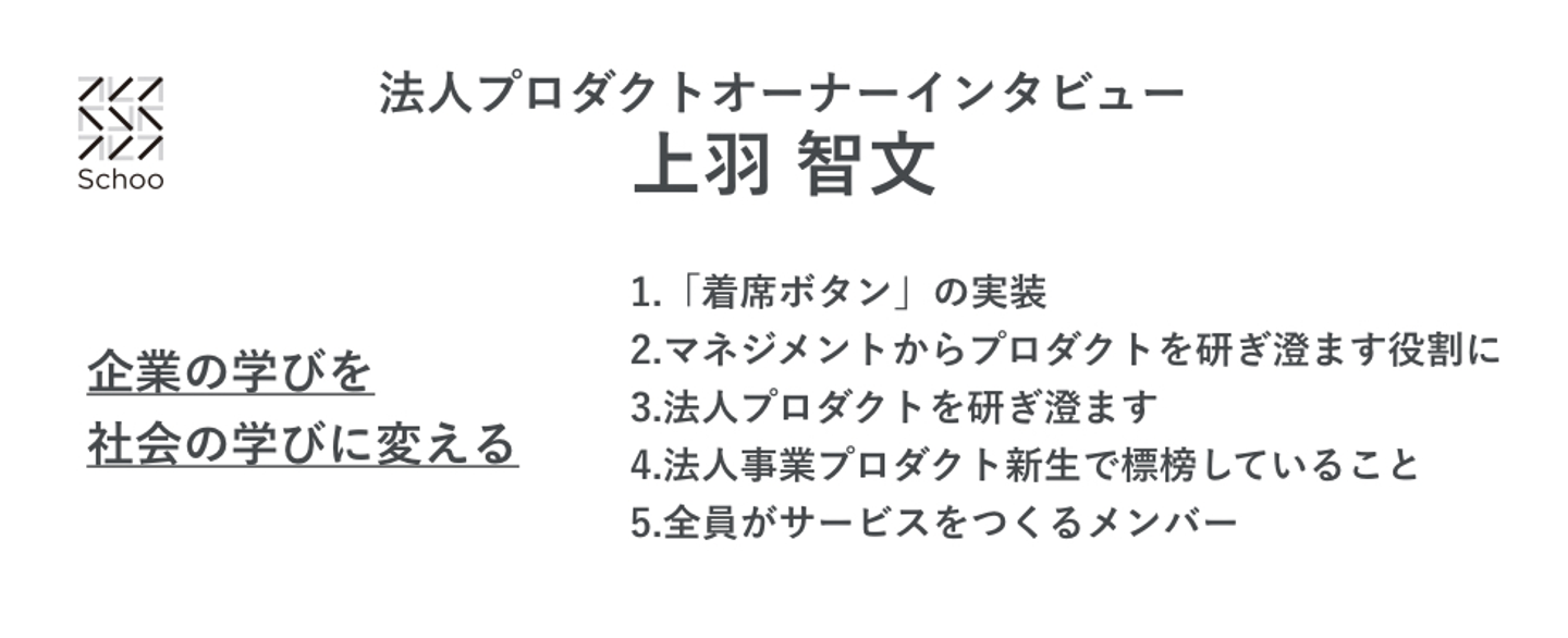 Schooの立ち上げ期からプロダクトに関わってきた上羽智文に、新生した法人事業のプロダクトオーナー兼デザイナー・エンジニアとしてこれからのプロダクトが目指していくことを聞きました。