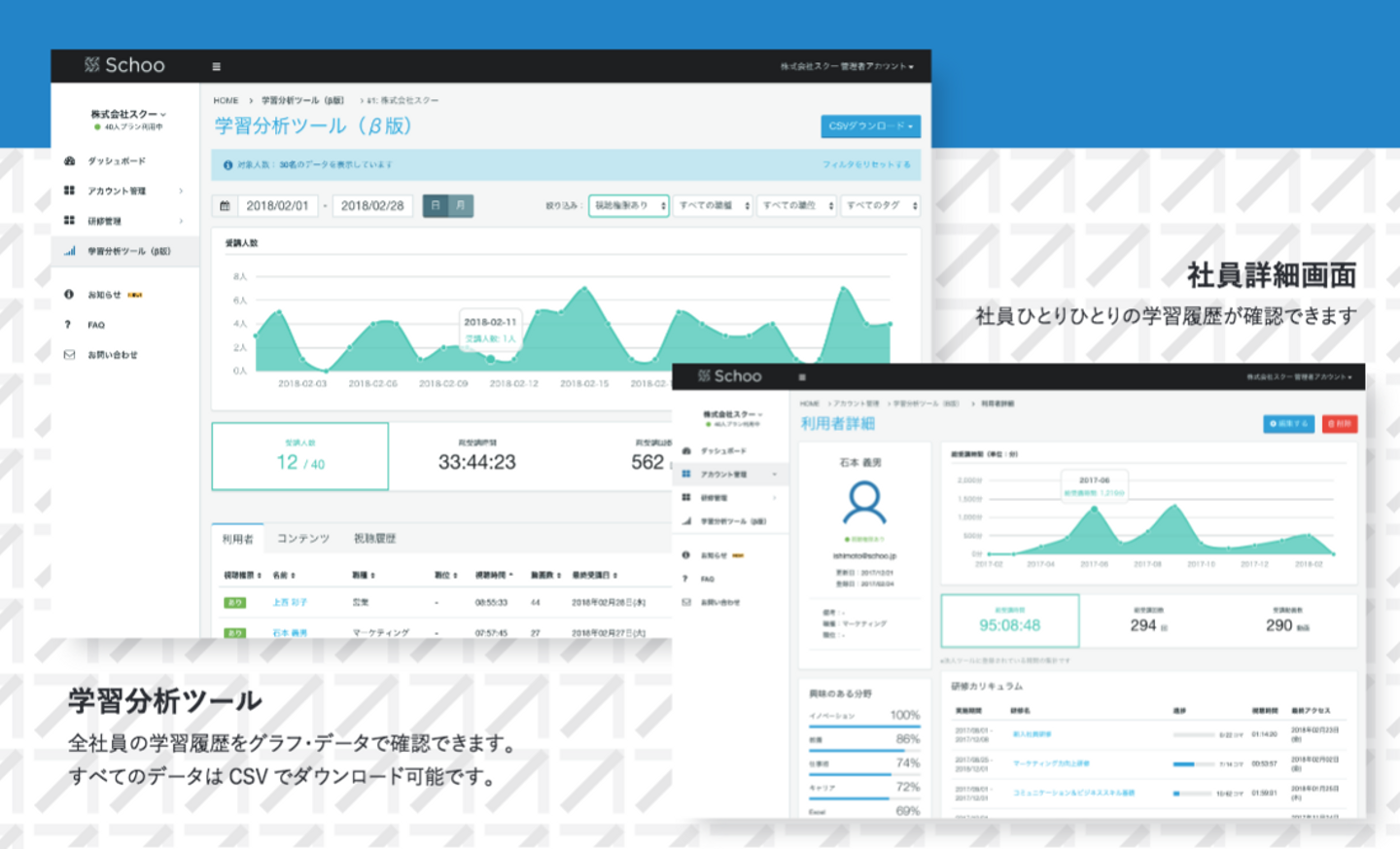 ・管理ツール:社員が受けた動画の一覧や、学習時間の把握ができる