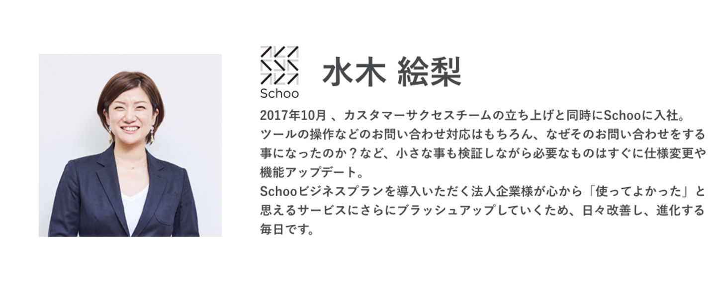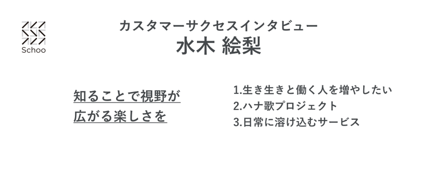 今回は、2017年にSchooのカスタマーサクセス立ち上げと同時に入社した水木絵梨のインタビューです。