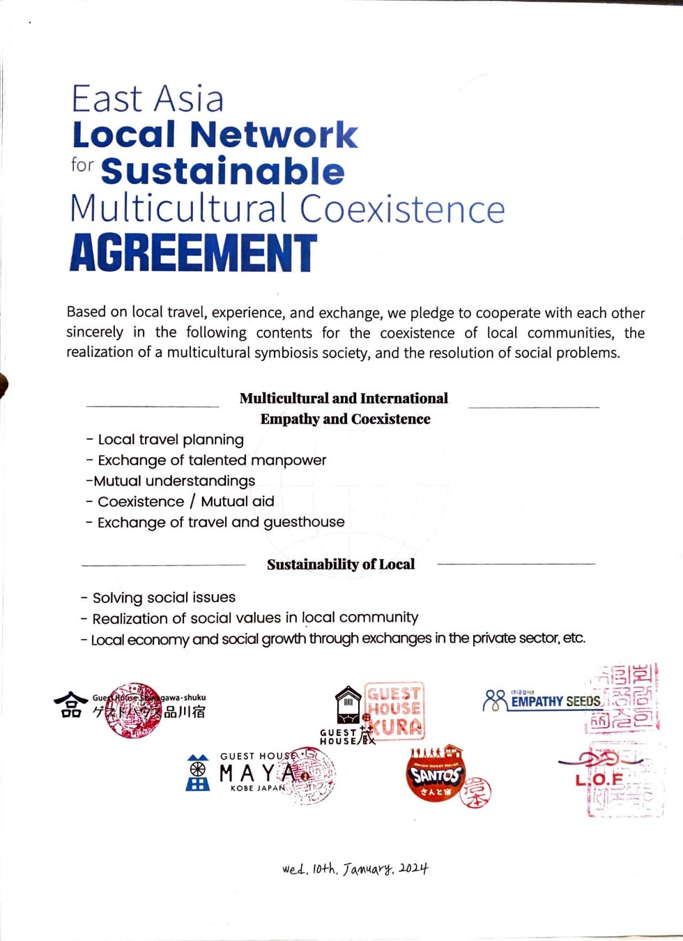 2024年1月10日、株式会社宿場JAPANは韓国の大邱において、現地でゲストハウス「共感ゲストハウス(EMPATHY GUESTHOUSE)」を運営する社会的企業「共感シーズ(EMPATY SEEDS)」と協定を締結しました。今回の協定は、ともに「ゲストハウス及び旅行業を通して社会課題を解決する」点において志を同じくする両社代表が、「LOCAL CONNECT」というスローガンの元に今後の協業、共同の取り組みを行うことを合意したものです。