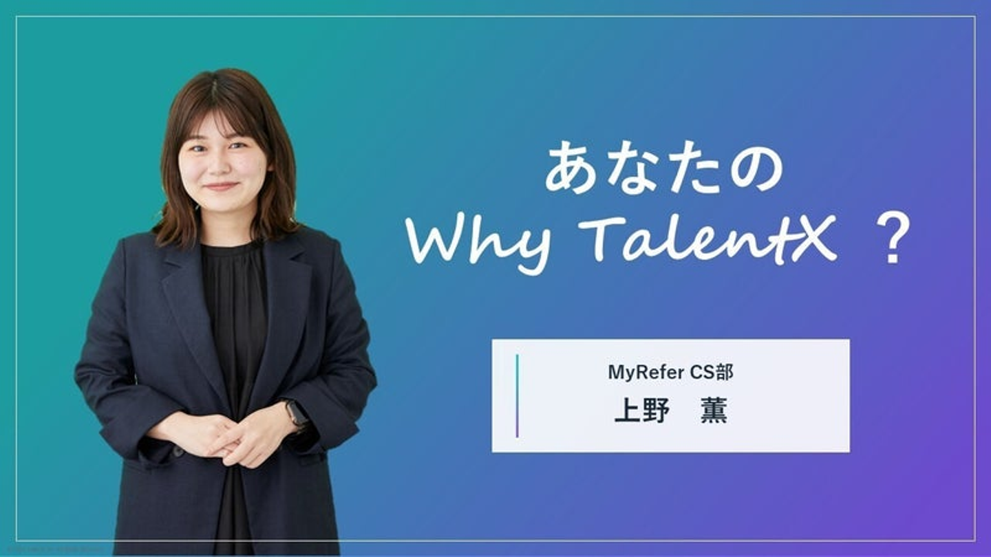 一言で言うと、次世代のスタンダードを創るチャレンジと事業の手触り感です。リファラルやタレントプール、今後のプロダクトも含め、MyReferが提供しているサービスは、「キャリア機会の最大化」に貢献している。今のキャリアにコミットしたい方も、次のキャリアにチャレンジしたい方も、「常に複数の選択肢がある中で、今このキャリアを選んでいる状態」を創れたらいいなと思っているのでそこに共感しています。個人的には、ビジネスが好きで、将来的には自分で事業を立ち上げていきたいと考えています。現在、TalentXでも新規事業の立ち上げに携わってるので、今のフェーズでは、自分のWillともマッチしています。・・・就活生の頃から、日本はエンゲージメントが低いという発言や記事を200回くらい、聞いてきたのですが、自分の中では2つの疑問がありました。・そもそも本当に低いのか?日本人特有のアンケート低くつけているだけではないか?・エンゲージメントを向上するサービスは複数あるが、あまり効果は無いのではないか?そんな漠然とした考えがあった中で、そもそも今の会社ありきでエンゲージメント改善のアプローチをするのではなく、ライフステージや状況に応じて会社や職務、働き方を選べた方が、キャリアに対してコミット出来る人が増えるのではないかと考えています。リファラルやタレントプールは、転職検討有無にかかわらず、個人のキャリアに対して、常に複数の選択肢を与えられるという点で、少しは働くを楽しむ人を増やせるのではないかと考えています。