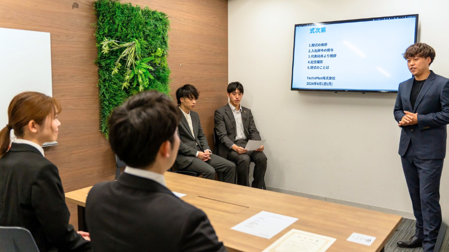 TechsPlusでは、この春、新卒・第二新卒の新入社員を2名迎え、4月1日に入社式を行いました。