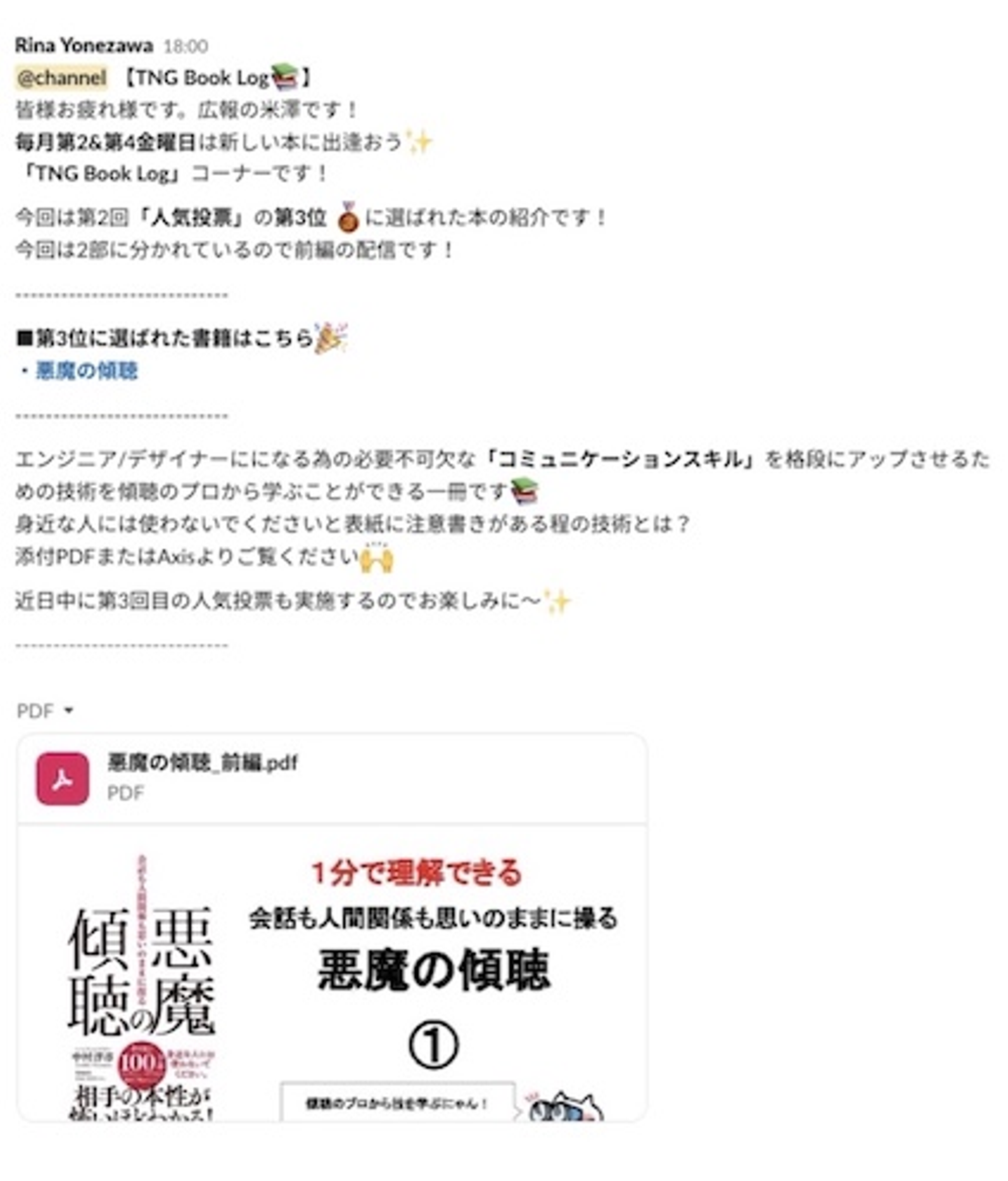 社内で利用しているSlackにて「福利厚生の一環として、新しい知識を身につけてもらいたい」という想いから開設した「TNGBookLog」