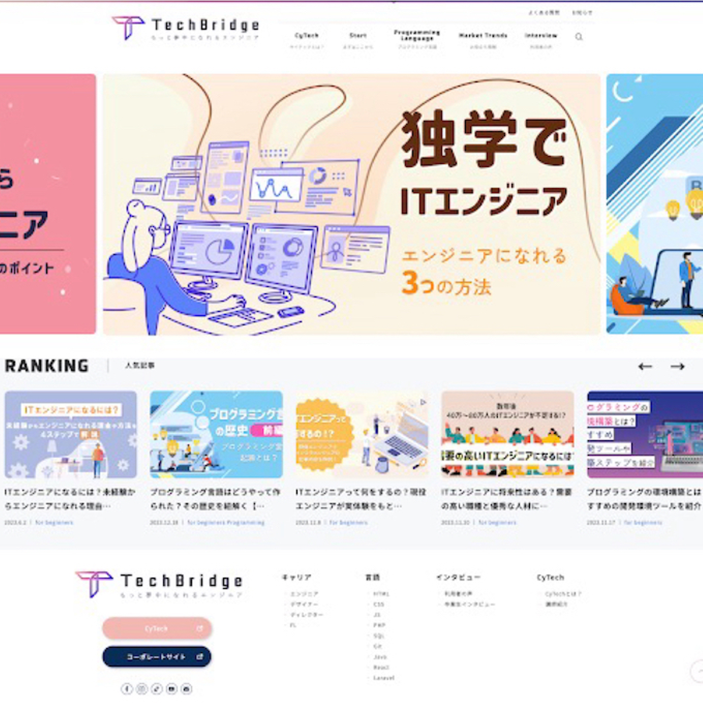 「TechBridge」は「もっと夢中になれるエンジニア」をキャッチコピーにした、IT業界未経験者がエンジニアへの道を1歩踏み出せるようなコンテンツを提供しているTheNewGateのオウンドメディアサイトです。