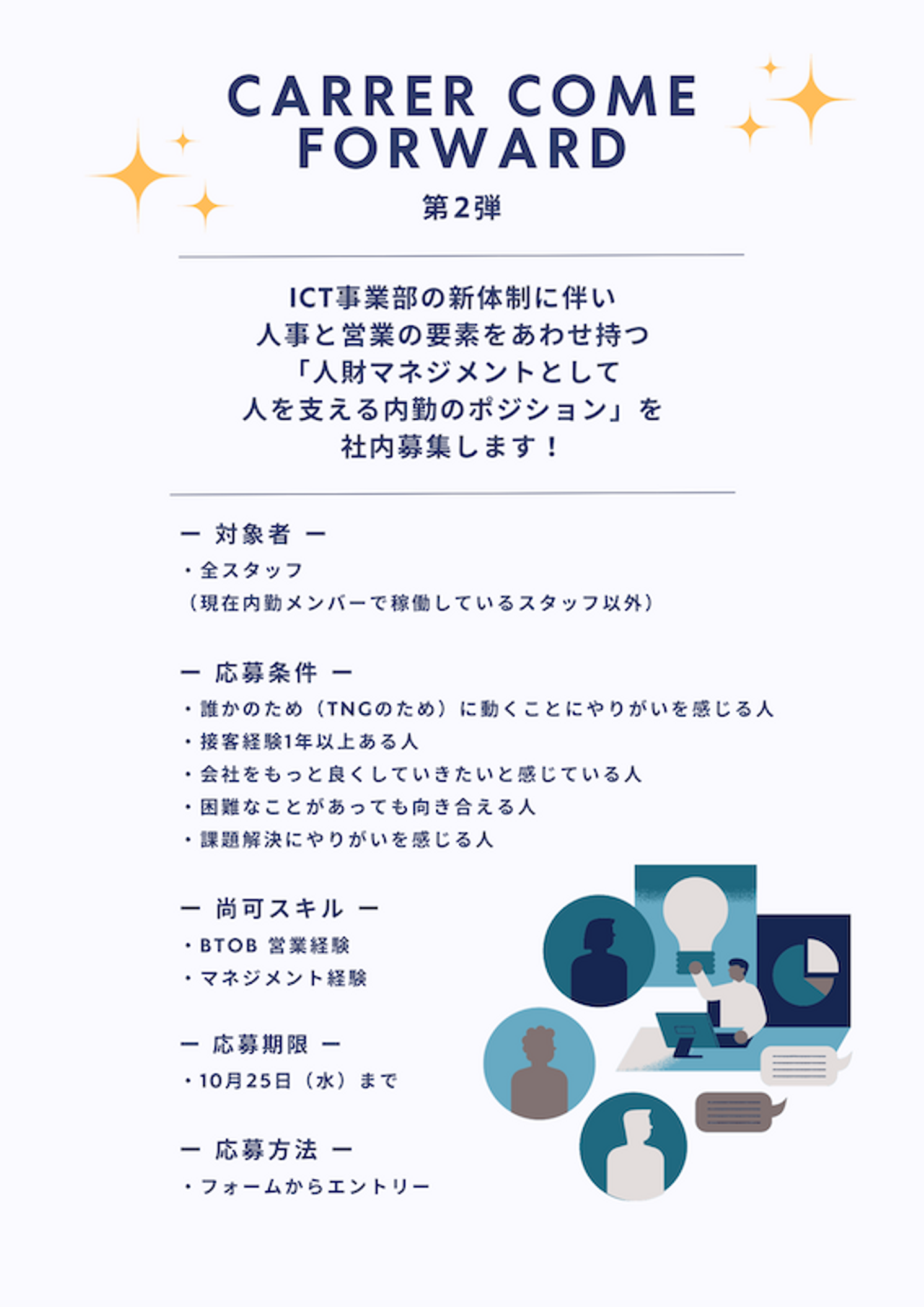 ICT事業部に新たな「人事」と「営業」の要素をあわせ持つ人財マネジメントとして「人を支えるポジション」を設立すると共にメンバーを募りました!