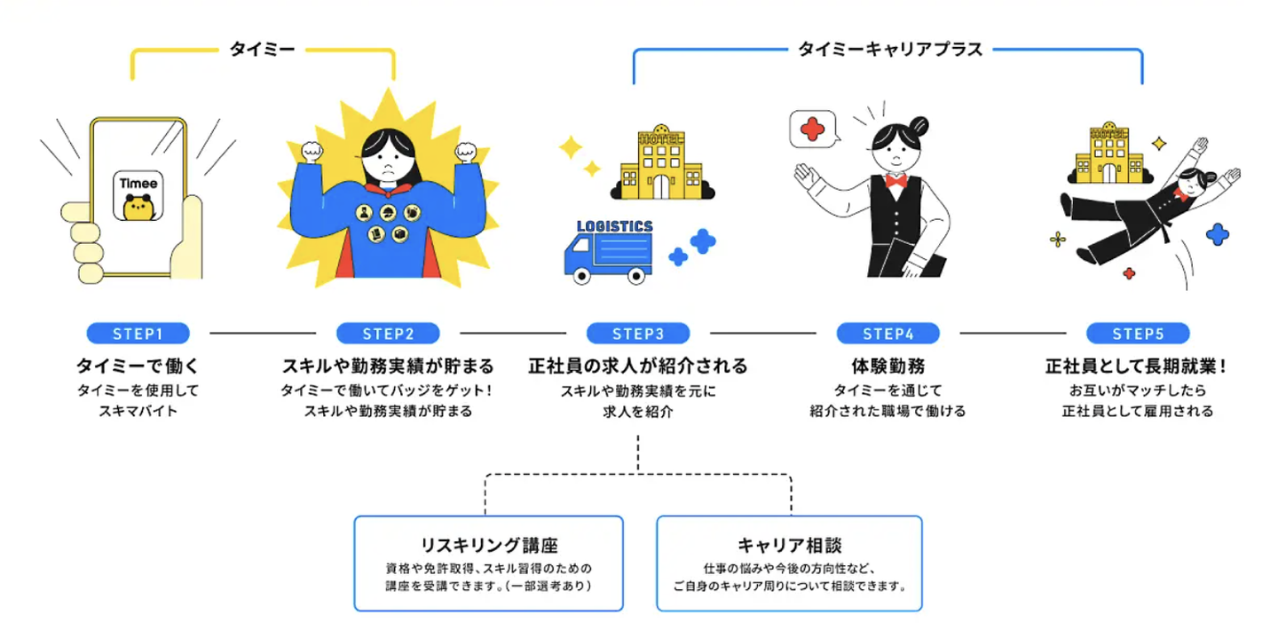 長期就業を望むワーカーと、長期雇用をしたい事業者を繋ぐ一助として、資格やスキルを身につける機会を提供しながらキャリア形成・転職支援までを一気通貫で行う「タイミーキャリアプラス」が着想されました。