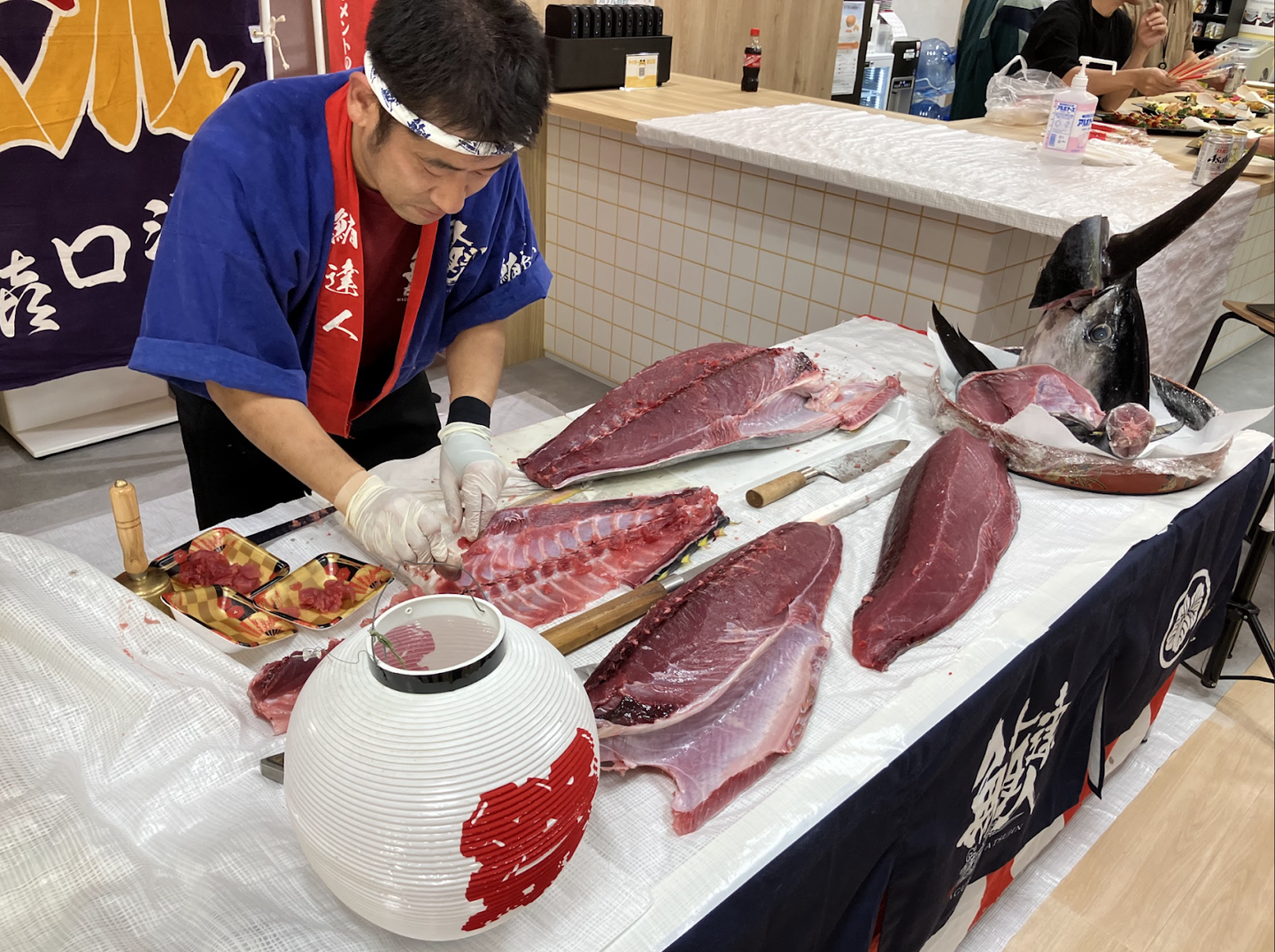 その場で解体した新鮮なマグロを配り、座談会スタート!