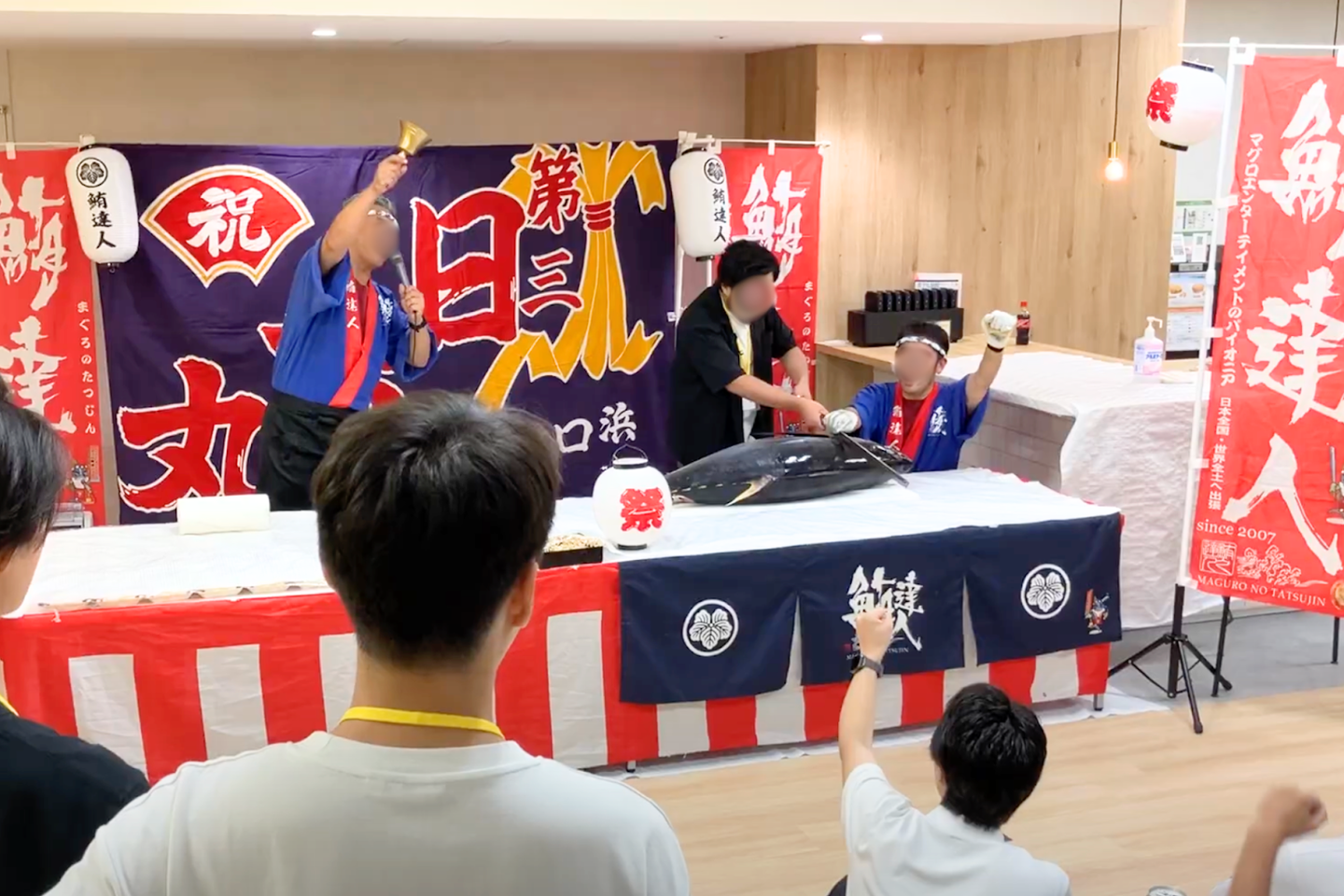 そして本日のメインイベント、マグロ解体ショー!今回も巨大マグロをオフィスで解体し大盛り上がり!ゲストの方に入刀を体験いただきました✨
