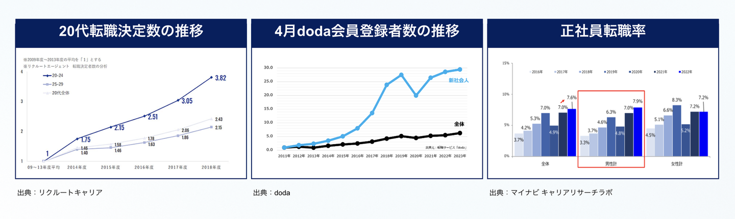 すべての年代で転職は当たり前の世の中になっていますが、とくに20代はその傾向が強いと言えるでしょう。新社会人の転職サイト登録者数は2023年時点で10年前と比べて30倍になっており、若手人材ほど「一つの会社でずっと働く」という考え方を持っていない傾向にあります。