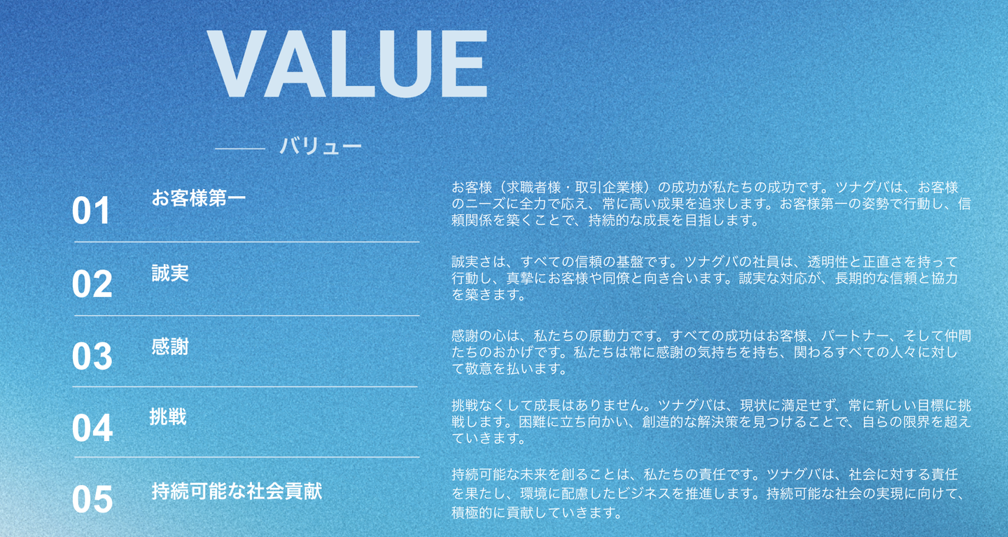 現在のミッション・ビジョン・バリューは、かなりの時間をかけて経営陣全員で考え「理想とする会社にしていきたい」という強い思いを込めています。そのため、採用でもこの内容に共感いただけるか、ツナグバが大事にする価値観に合っている方かどうかをかなり重視しています。