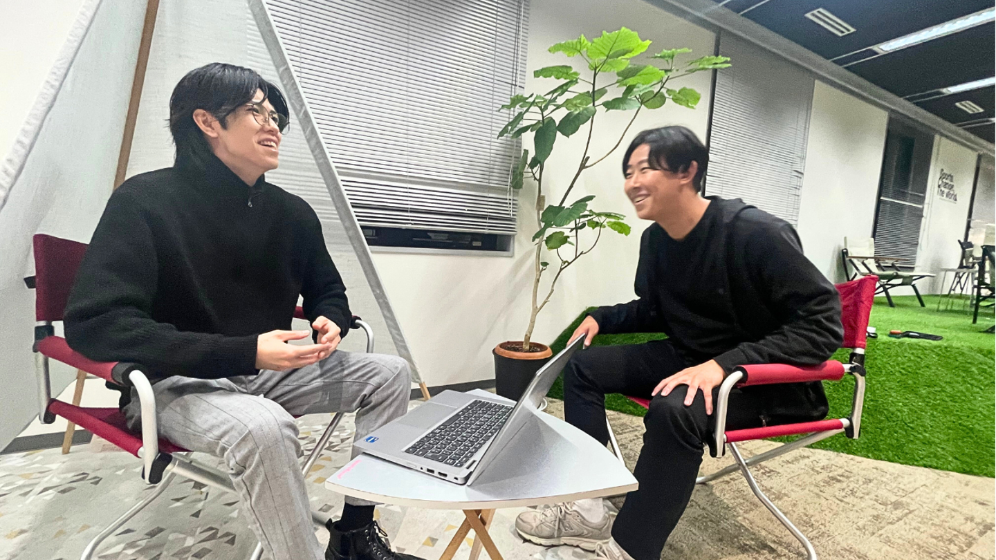 同期の大森裕太さんと去年のキックオフ時に撮ったものだそう。中途入社でもみんな未経験スタートなので同期の絆が深いのが当社の魅力☆