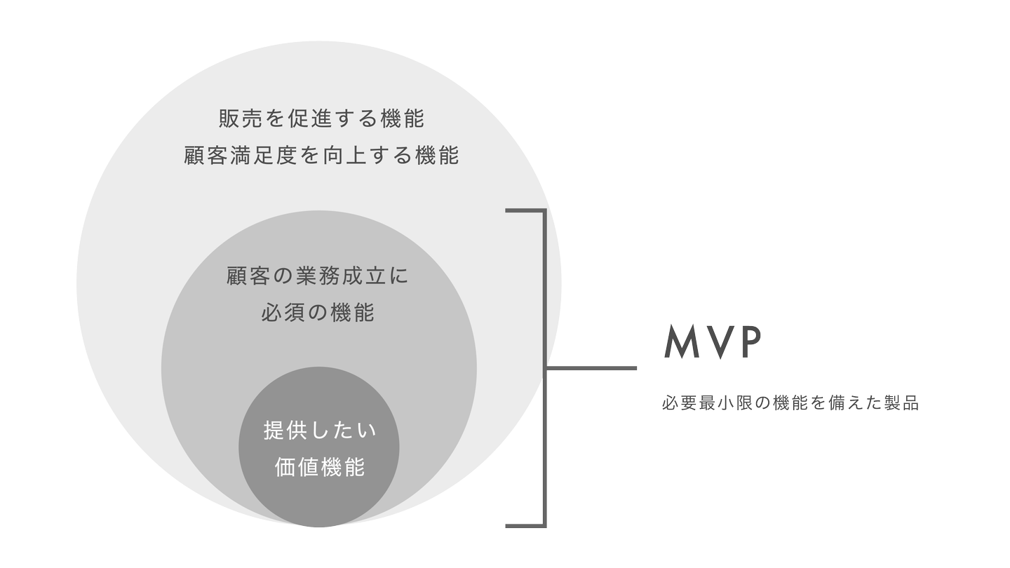 しかし、当然ながら、コア機能だけではプロダクトとして成立しません。顧客の業務オペレーションを想定し、その業務を成立させるために必要な機能を備える必要があります。リーンスタートアップ(必要最小限の機能を備えたプロダクトを素早く顧客に提供し、仮説検証を繰り返すことで成功率を高める手法)にのっとるならば、顧客の業務オペレーションを想定し、要求を機能として開発すべきものと、運用でカバーすべきものに切り分け、必要最小限の機能は何かを定義する必要がありました。つまり私たちにとってのMVP(Minimum Viable Product)とは何か?という問題です。