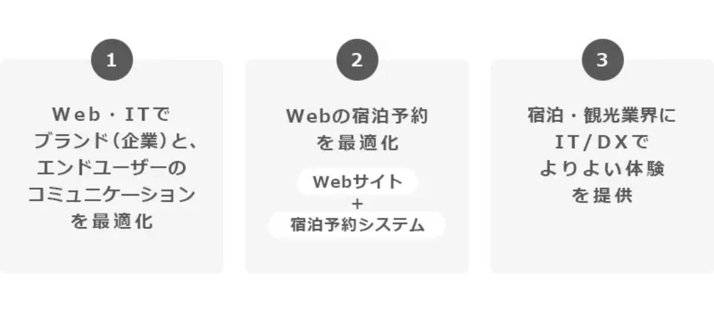 ③ 宿泊・観光業界に、慢性的に広がる人材不足のソリューションとしてIT/DX化を進める。一歩踏み出したDX化を、ブランド(企業)規模問わず推進し地域・社会に貢献する。