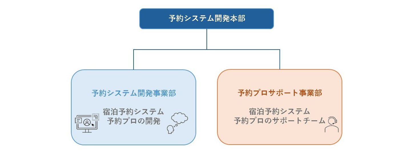 予約システム開発本本部は主に予約プロのサポートを行なっている「予約プロサポート事業部」と、予約プロの開発を行なう「予約システム開発事業部」に分かれており、今回はエンジニアとして「予約システム開発本部」への配属になります。