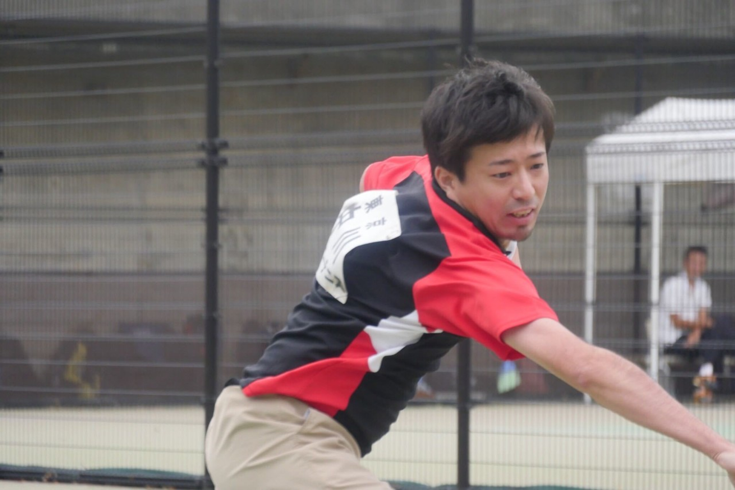 遠くのボールを撃ち返そうとする中川さん=2019年9月