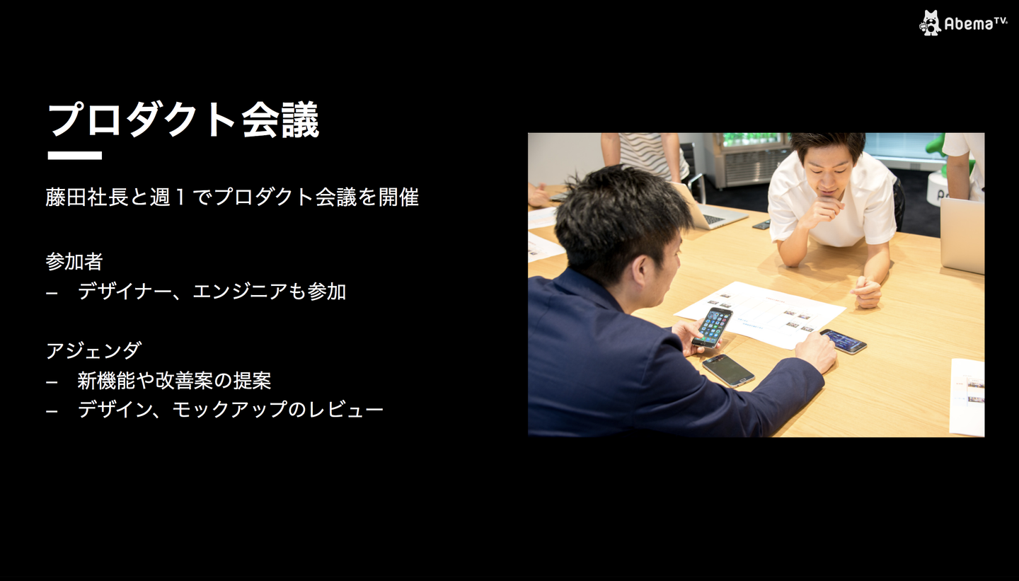 「AbemaTV」では現場エンジニア / デザイナーと代表 藤田で週に1度開発ミーティングを実施。ミーティングでは全体の開発優先度のすりあわせや主要機能の確認、デザイン・モックのチェックを主に行っています。デザインやモックなどのアウトプットをもとに、実現したいユーザー体験から細かなラベリング、インタラクションに及ぶまで藤田と現場の技術者たちが共に考えるのが特徴です。