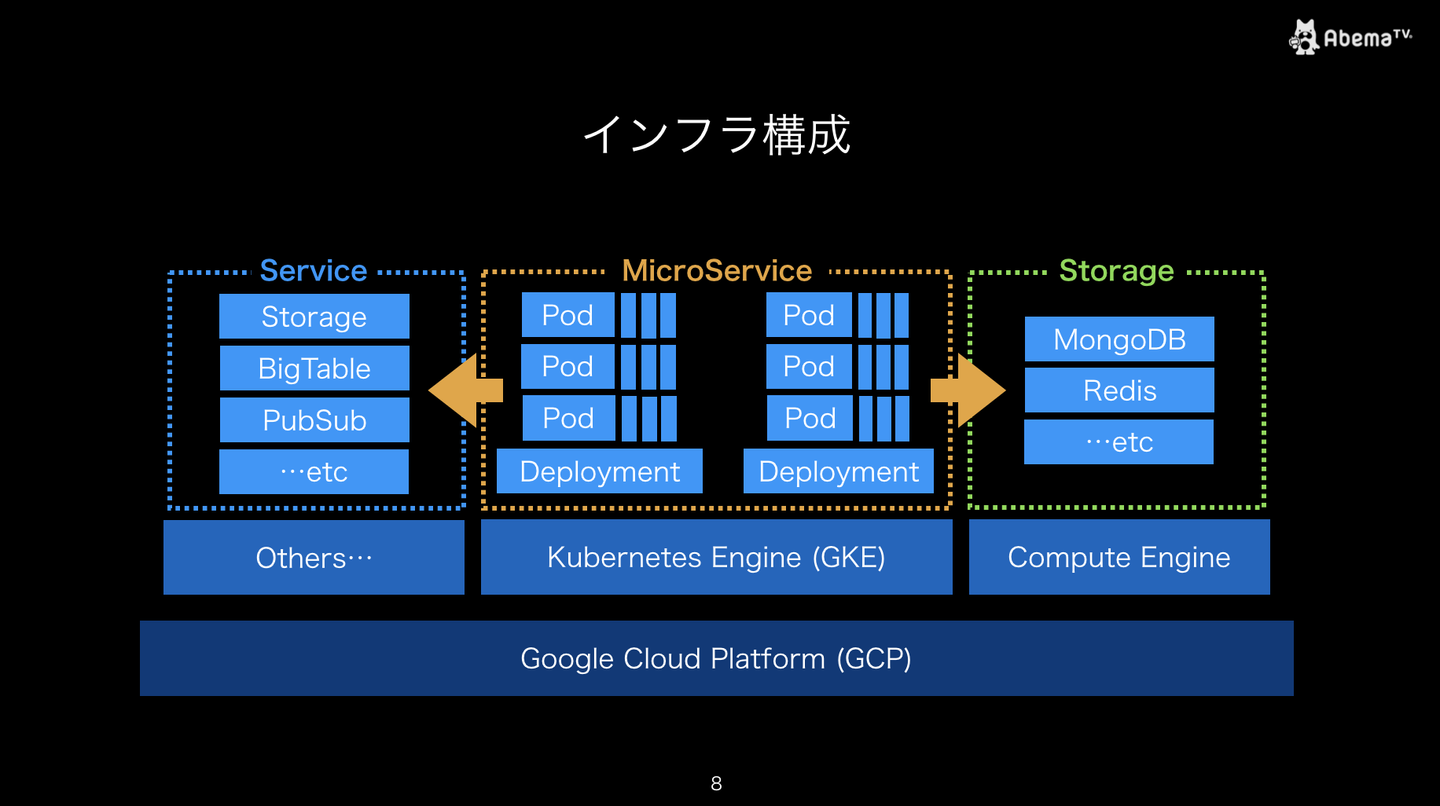 まずは「AbemaTV」サーバーサイドにまつわる技術キーワードを紹介したあと、インフラの構成について説明いたしました。