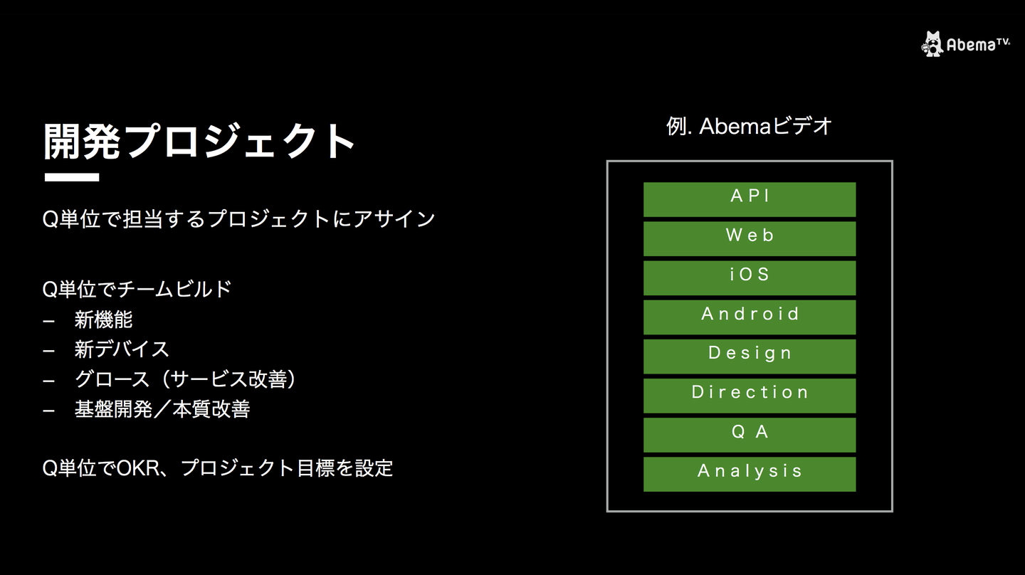 また、「AbemaTV」では職種を横断した機能ごとのプロジェクトをQ単位で組成し、開発を行っています。当日は「Abemaビデオ」を例に開発の進め方をご紹介しました。